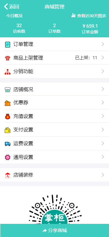 通过今日概况了解商城的访客数、订单数、订单金额信息,管理订单、商品、分销等功能