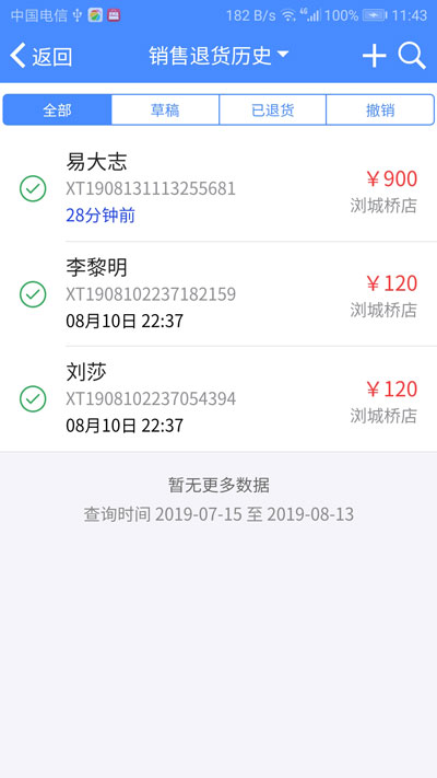 点击右上角的【放大镜】图标,可以按客户、单号、门店、销售员、单据日期筛选历史单据