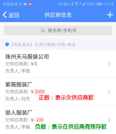 点击供应商对账页面的【紫薇服装厂】进入查看供应商详情,在点击【欠供应商款】右侧的箭头进入对账页面